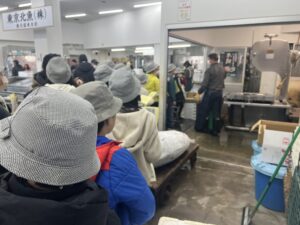 5年生ともなると落ち着いており、スッと立ってスッと移動して静かに見学されていました。 冷凍マグロの解体の際は少し声を出して驚かれていましたが、質問もしっかりされており、メモもきちんと取っていました。