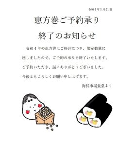 恵方巻ご予約承り終了のお知らせ☆海鮮市場食堂
