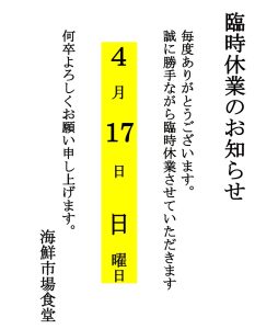 4月17日・日曜日 臨時休業のお知らせ☆海鮮市場食堂