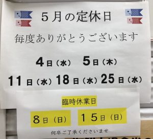 海鮮市場食堂よりお知らせです。 毎度ご来店頂き誠にありがとうございます。 直近の食堂休業日をお知らせ致します。 食堂休業日 5月 4日 水曜日 5月 5日 木曜日 5月 8日 日曜日 5月11日 水曜日 5月15日 日曜 […]