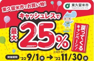 2022年9月1日(木)より、東久留米市の地域経済にかかるデジタル化を進めること(消費者及び事業者のキャッシュレス化を推進)を目的に、市内のお店にて消費者がキャッシュレス決済を行う際に支払額の最大25%のポイントを還元す […]