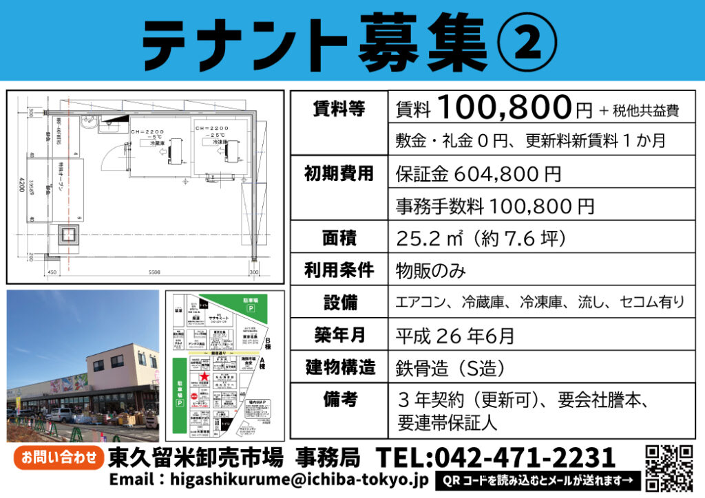 当市場では下記、市場内店舗のテナントを募集しております。