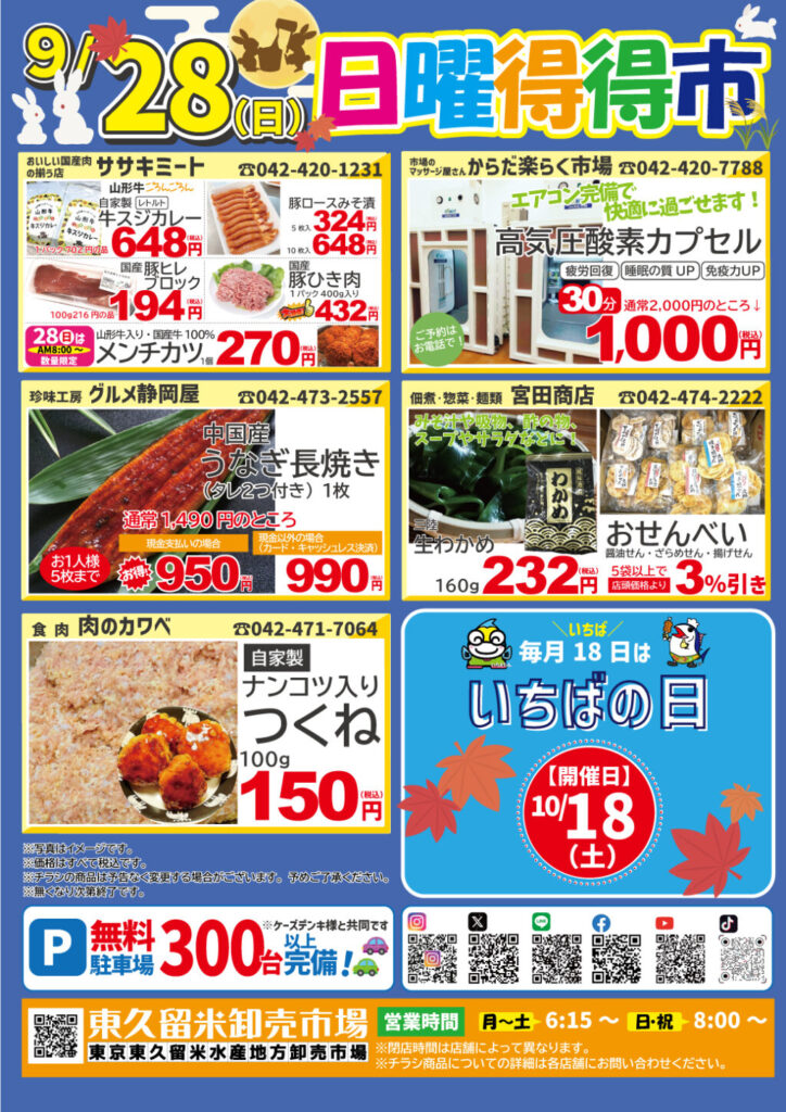 特売情報 ★★日曜得得市★★9/28(日) 朝8時open♪ ※一部店舗は休業となります 2025年9月24日 最終更新日時 : 2025年9月24日 tokutokuadmin ※写真はイメージです。※価格はすべて税込です。※内容は予告なく変更する場合がございますので予めご了承ください。※無くなり次第終了いたします。