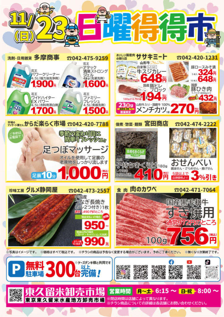 特売情報 ★★日曜得得市★★11/23(日) 朝8時open♪ ※一部店舗は休業となります 2025年11月18日 最終更新日時 : 2025年11月18日 tokutokuadmin ※写真はイメージです。※価格はすべて税込です。※内容は予告なく変更する場合がございますので予めご了承ください。※無くなり次第終了いたします。