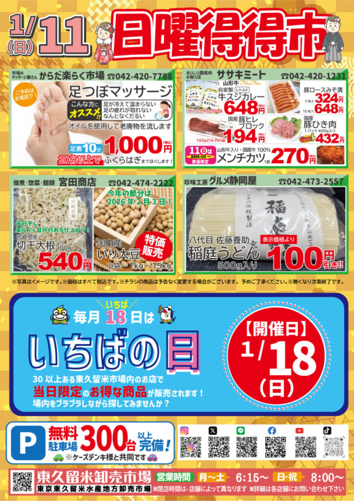 特売情報 ★★日曜得得市★★1/11(日) 朝8時open♪ ※一部店舗は休業となります 2026年1月6日 最終更新日時 : 2026年1月6日 tokutokuadmin ※写真はイメージです。※価格はすべて税込です。※内容は予告なく変更する場合がございますので予めご了承ください。※無くなり次第終了いたします。