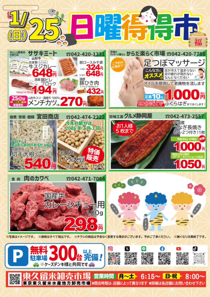 特売情報 ★★日曜得得市★★1/25(日) 朝8時open♪ ※一部店舗は休業となります 2026年1月20日 最終更新日時 : 2026年1月20日 tokutokuadmin ※写真はイメージです。※価格はすべて税込です。※内容は予告なく変更する場合がございますので予めご了承ください。※無くなり次第終了いたします。