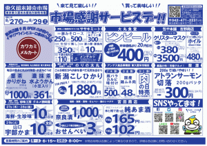 《再々投稿》市場感謝サービスデー 8/20(木)~22(土) 2020年8月20日 最終更新日時 : 2020年8月20日 tokutokuadmin 先ほど掲載したチラシに誤りがございましたので再度投稿致させていただきます。 お客様には大変ご迷惑をおかけし、深くお詫び申し上げます。 今後とも変わらぬご愛顧を賜りますようお願い申し上げます。